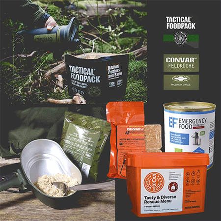 Emergency food with long shelf life Tactical Foodpack (at least 8 years) CONVAR (at least 20 years) PRO RATION (at least 15 years)Large selection of products✔ A good emergency supply for crises and emergencies is an essential part of personal preparedness.