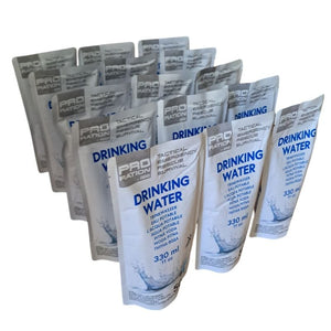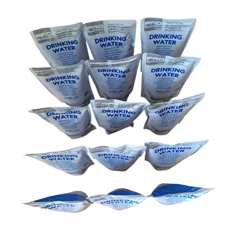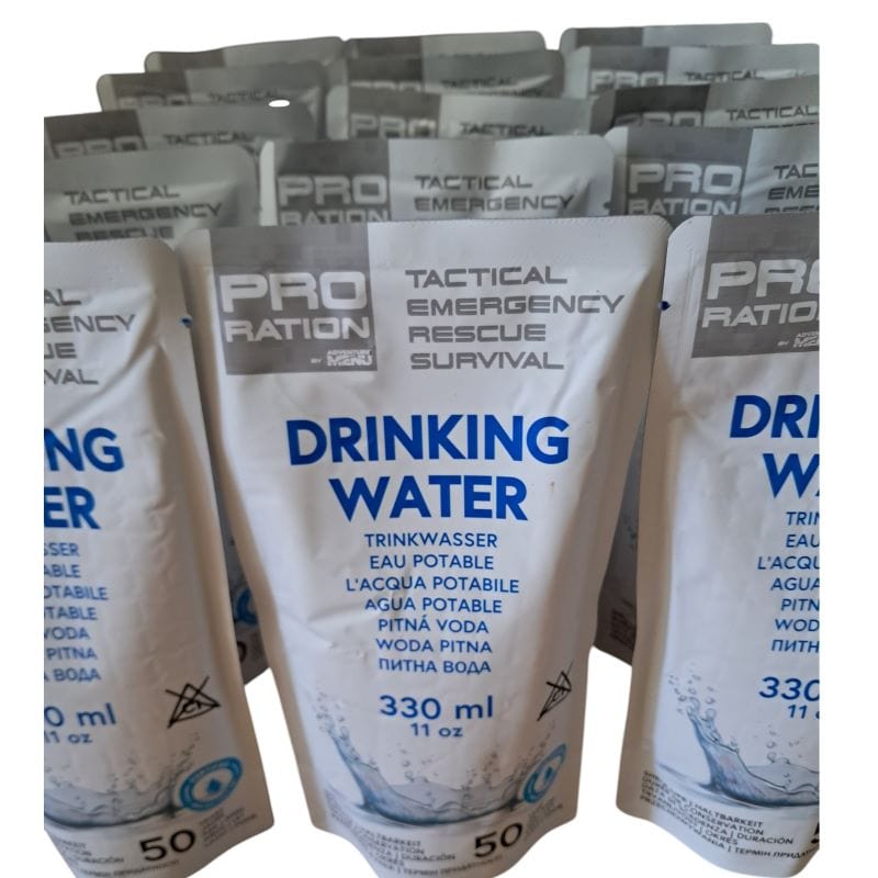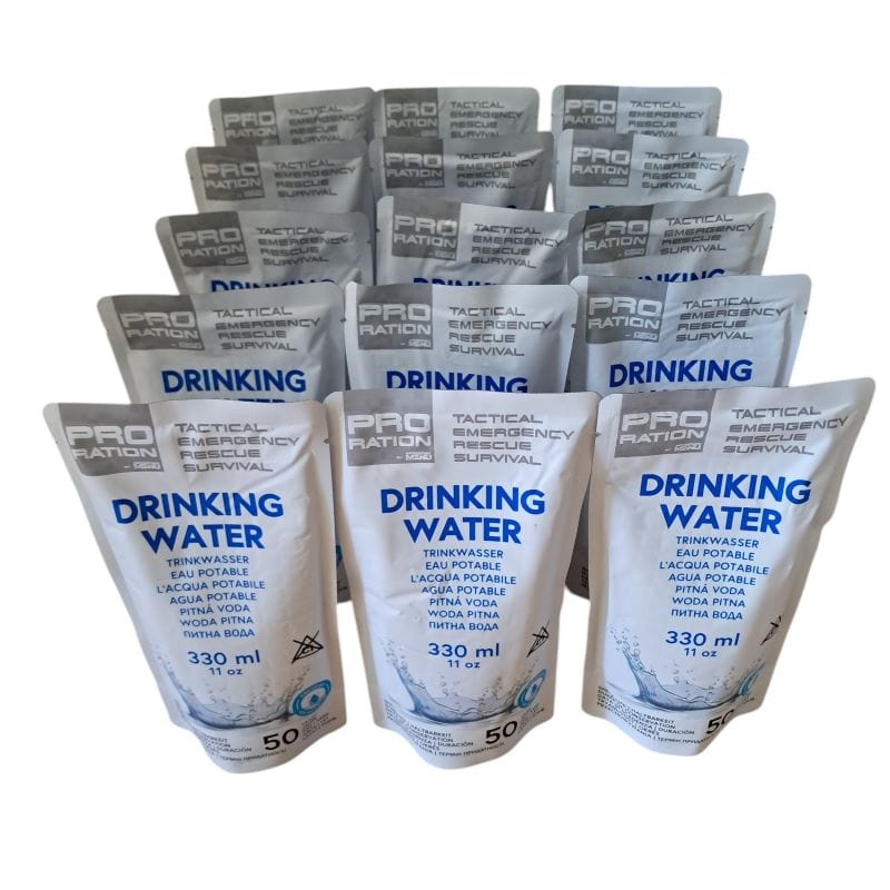 PRO RATION Emergency Water Package: enthält insgesamt 15 einzeln verpackte Trinkwasserrationen a 330ml. Mindesthaltbarkeit beträgt 50 Jahre ab Herstellungsdatum. 100% natürlich - enthält keine Zusatzstoffe.