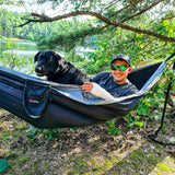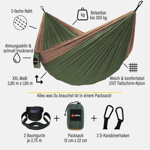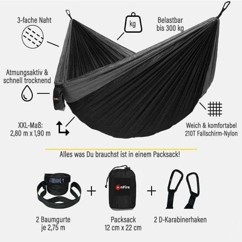 Meine erste Hängematte. Habe sonst Isomatte verwendet. Die Aufhängung ist sehr variabel, da findet man immer eine Möglichkeit. Die Hängematte ist riesig, ich passe mit Hund rein und liege trotzdem tief drinnen, so dass man eigentlich nicht rausfallen kann. Wie jemand anderes schon geschrieben hat ist das Material dünn. Macht aber trotzdem einen stabilen Eindruck. Dadurch trocknet es aber auch schnell. Gut finde ich auch, dass der Transportsack mittig an der Matte ist. So kann man den nicht verlieren und kann da beim Pennen Taschenlampe, Handy und sogar ein Taschenbuch verstauen. Ist dann griffbereit und liegt nicht auf dem Boden.