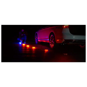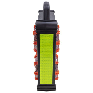 Die rundum strahlenden 360°-LEDs sind schon aus großer Entfernung erkennbar. Zusätzlich sorgen vier nach oben gerichtete LEDs für noch bessere Sichtbarkeit. Das robuste, wasserdichte Gehäuse (IP68) aus schlagfestem Kunststoff macht die Flares nahezu unverwüstlich – selbst ein Überfahren durch Fahrzeuge bis zu drei Tonnen überstehen sie problemlos.