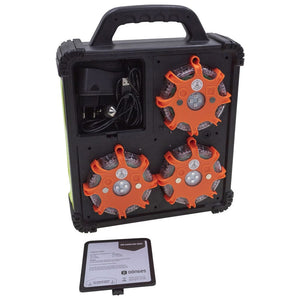 Sie können zwischen sechs verschiedenen Lauflichtmodi wählen und die Farbe auf Knopfdruck anpassen: Gelb, Blau oder Grün. Zum Set gehören sechs Signalleuchten, eine Transportbox mit Ladefunktion sowie ein Ladegerät für 230 V und 12 V.