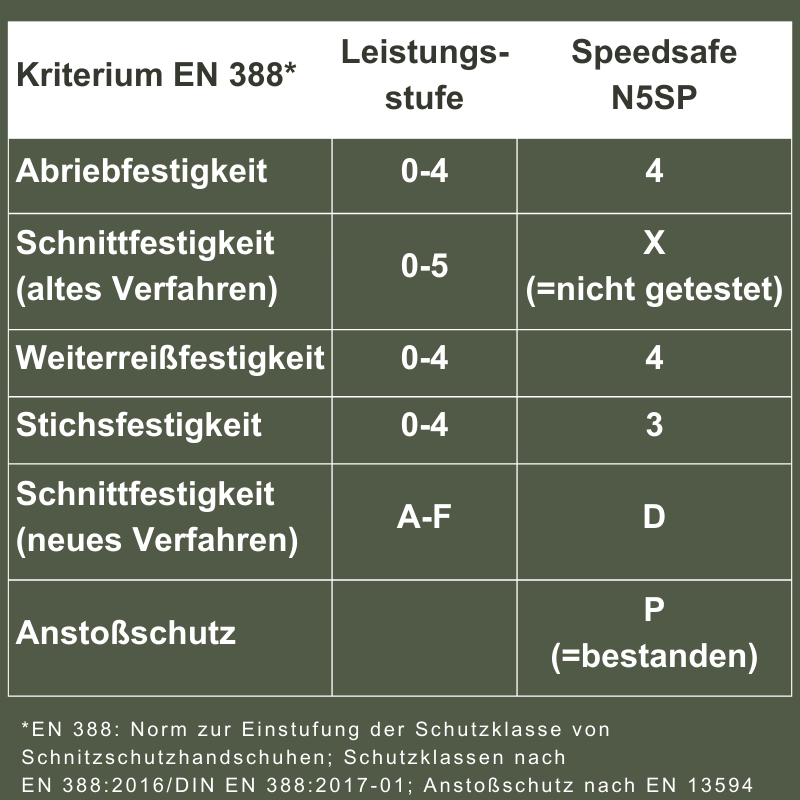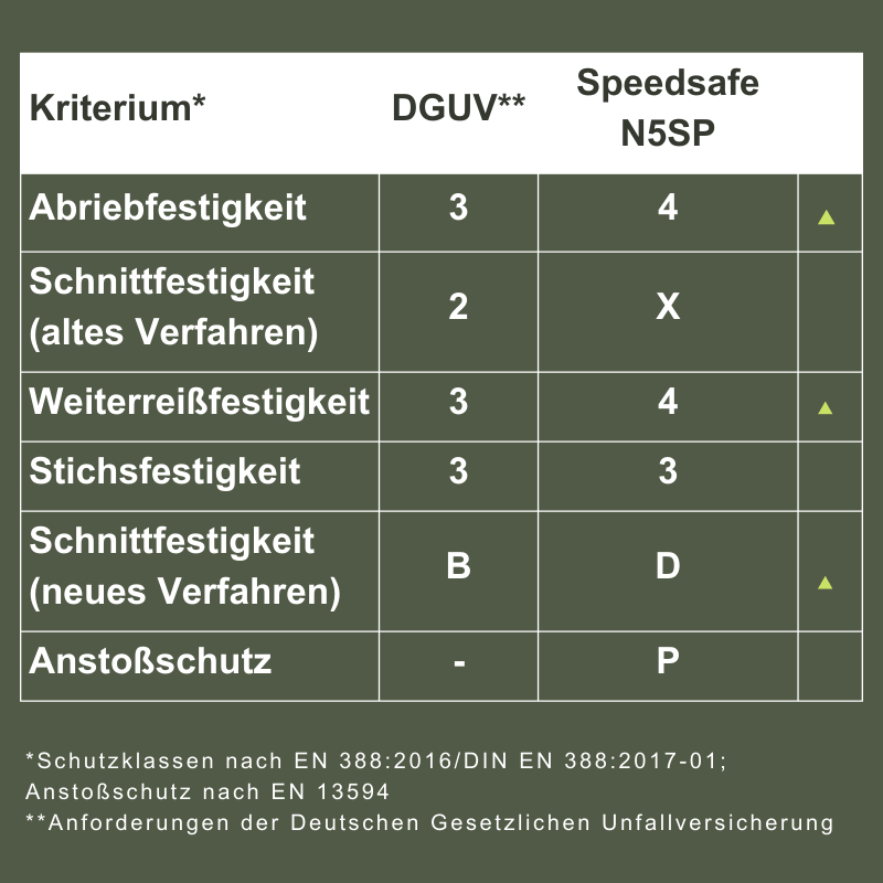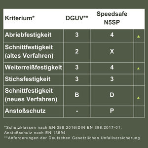 Wie man der nachstehenden Tabelle entnehmen kann, erfüllt der Speedsafe N5SP alle Anforderungen und liegt bei den Leistungsstufen für Abriebfestigkeit, Weiterreißkraft und Schnittfestigkeit (neues Verfahren) sogar über den Mindestanforderungen der DGUV.