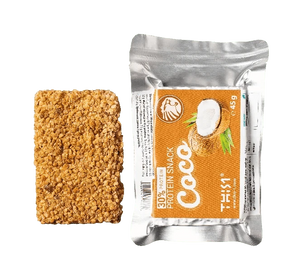 Nussmischung 66 % (Erdnüsse, Cashewnüsse), Molkenproteinisolat, Rohrzucker, Glukosesirup, Dextrose, Kokosfett, Rapsöl, Kokoschips 8 %, Magermilchpulver, Kokosgeschmack, Weißschokoladengeschmack, Lecithin-Emulgator (aus Soja).